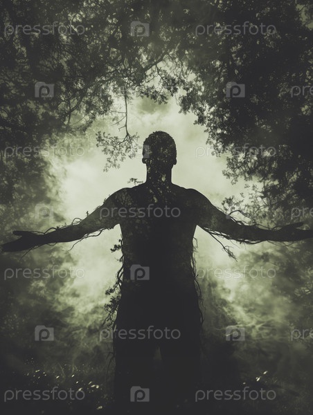 Силуэт молодого взрослого человека, сливающегося с природой в эффекте двойной экспозиции
