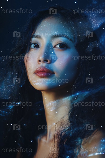 Портрет молодой взрослой азиатской женщины, глядящей на себя во время двойной экспозиции Звёздный эффект