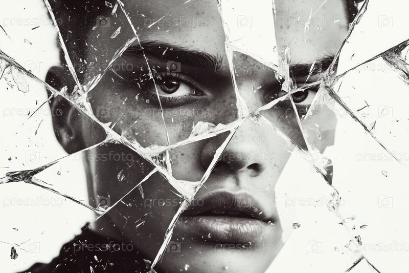 Портрет молодой взрослой женщины, глядящей через отражение разбитого стекла