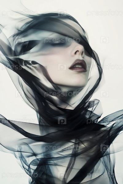 Молодая взрослая женщина погружает лицо в текущее полотно из чистой ткани