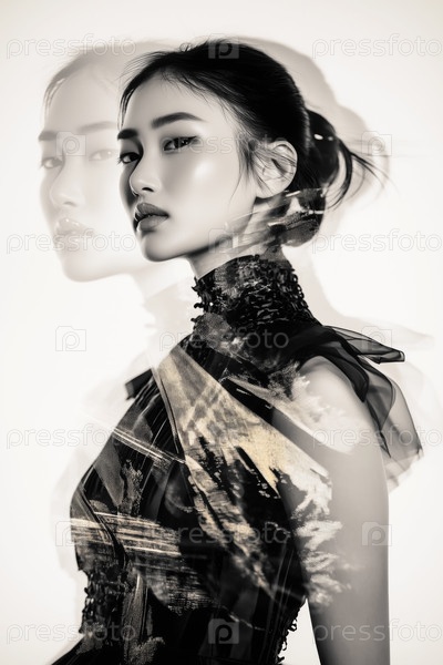 Молодая взрослая азиатская женщина позирует в двойной экспозиции Художественная композиция