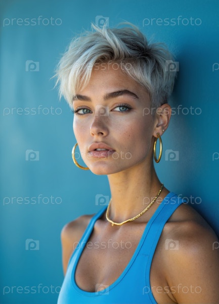 Портрет молодой взрослой женщины, стоящей на синей стене и выглядящей уверенно