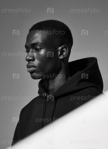 Молодой чернокожий мужчина задумываясь позирует в студии с драматическим освещением
