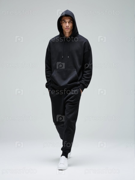 Молодой человек идет вперед с руками в карманах на студии