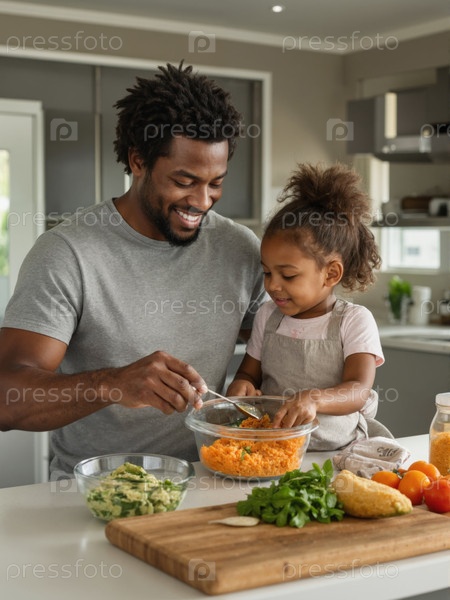 Мужчина и молодая чернокожая девушка готовят здоровую еду вместе на кухне