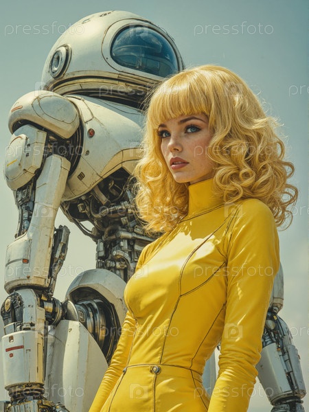 Молодая взрослая женщина стоит рядом с футуристическим роботом на открытом воздухе