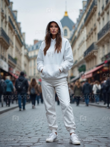 Молодая взрослая женщина уверенно стоит на оживленной городской улице