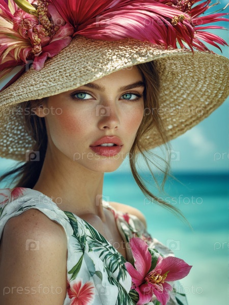 Портрет молодой женщины в цветной шляпе, стоящей на улице