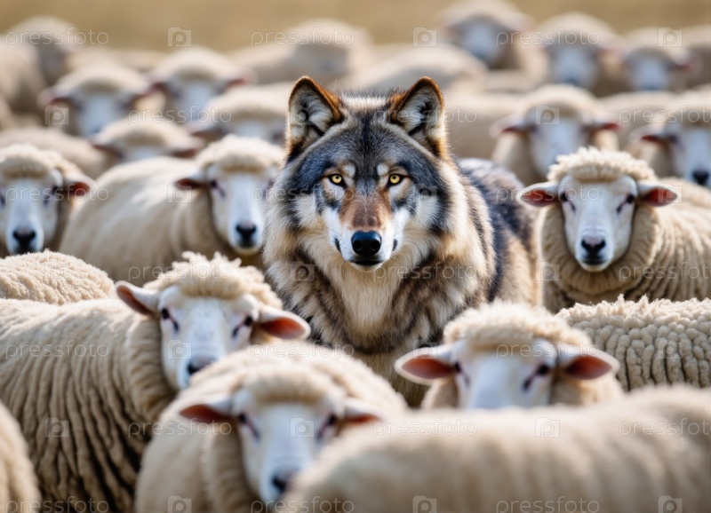Волк стоит среди стада овец на пастбище и смотрит прямо вперед