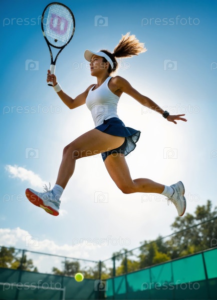Молодая взрослая азиатская женщина прыгает, играя в теннис на открытом поле