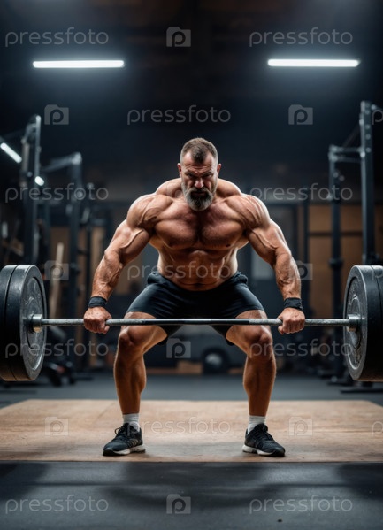 Мужчина среднего возраста, занимающийся пауэрлифтингом в тренажерном зале, показывает мышечную силу