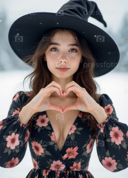 Портрет молодой женщины, носящей колдовскую шляпу и делающей сердечный жест