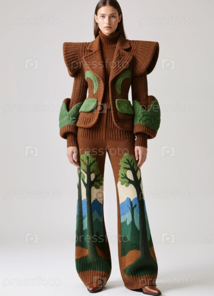 Молодая взрослая женщина, носящая художественную трикотажную одежду с мотивами природы