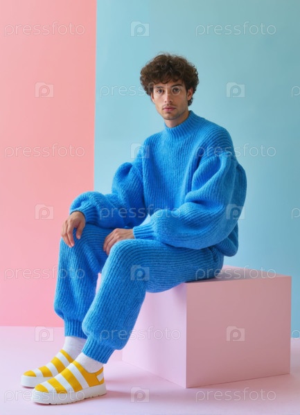 Молодой человек сидит на кубе, позируя на пастельном фоне