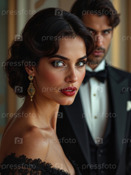 Портрет молодой взрослой женщины, глядящей на себя в то время как за ней стоит элегантный мужчина