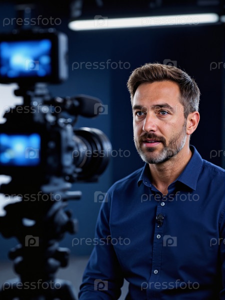 Молодой взрослый мужчина говорит во время видеозаписи в студии