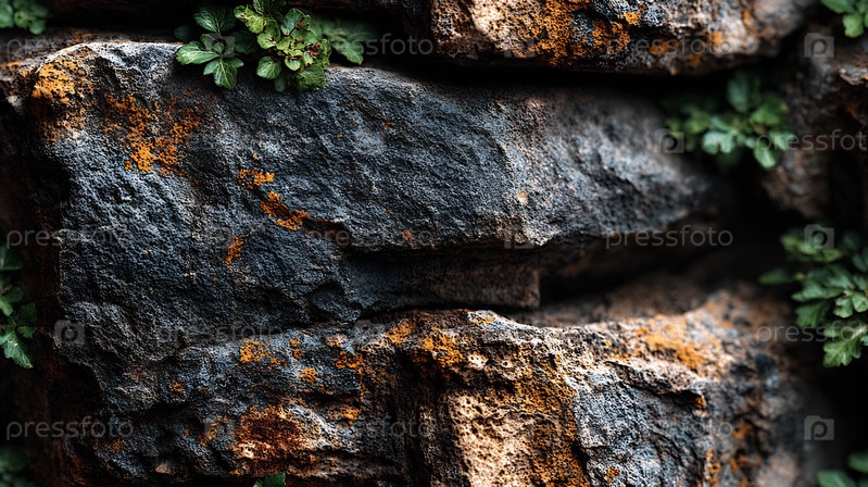 Стены из текстурированного камня сближаются. характеристики грубых темных камней, зеленого листья и натуральных оранжевых оттенков. бесшовные плитки