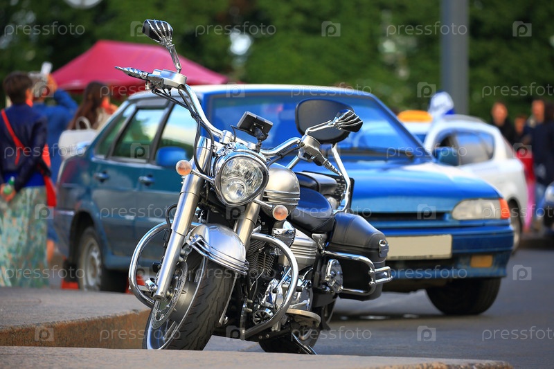 Припаркован серебряный мотоцикл и синий легковой автомобиль