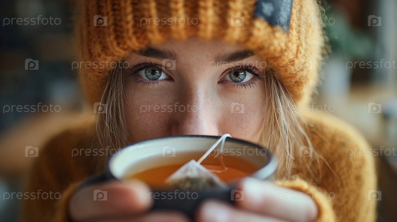 Молодая женщина в шляпе пьет теплый чай