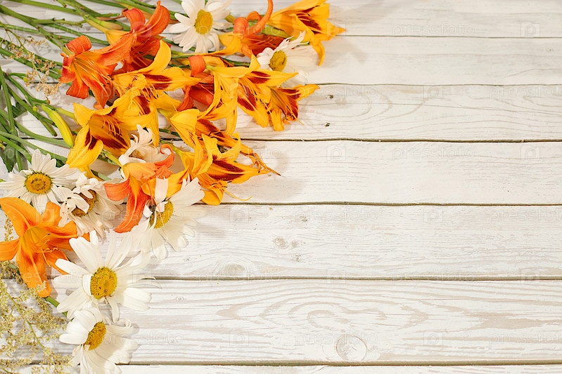 Рекламный баннер с красивыми цветами садовой ромашки и лилии, летняя солнечная открытка. абстрактная цветовая композиция и элегантная концепция красоты, фон для отображения экологических продуктов