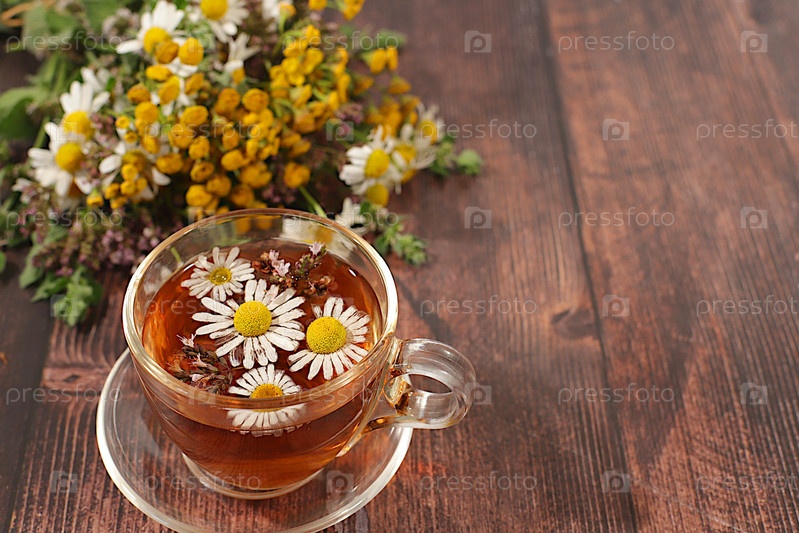 Чай из дикорастущих лекарственных трав на деревянном столе, букет герба святого Иоанна, орегана, мяты, ромашки, танзы. Коллекция полезных трав для лечения по народным рецептам
