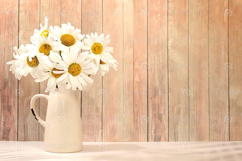 Натюрморт с красивыми цветами ромашки в вазе на элегантном деревянном фоне, летний рекламный баннер, абстрактная цветовая аранжировка, праздничная открытка с пространством для текста