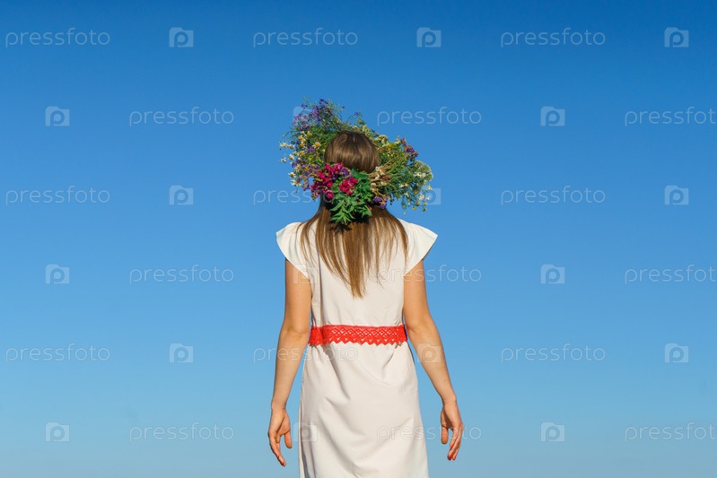 Девушка в белом платье славянского вида с венком диких цветов на голове стоит прямо, руки опустили