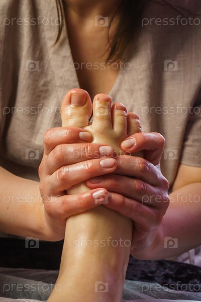 Естественная медицина, рефлексология, женщина получает массаж ног, подавляет точки энергетического потока, спа спокойный интерьер, ближайший план