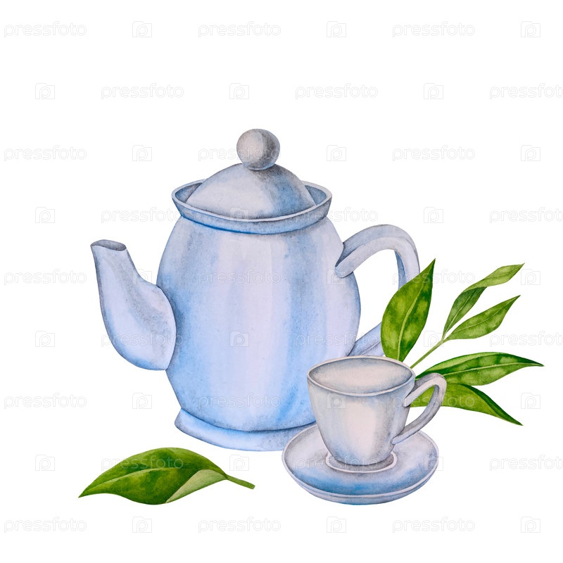 Зеленые свежие чайные листья, чашка чая и чайник для варки, чаепитие с цветками розового бедра и ягодами. Иллюстрация Международного дня чая. Акварель вручную нарисованная изолированными элементами