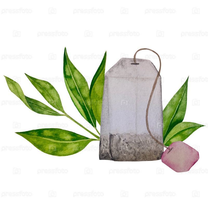 Зеленые свежие чайные листья, чашка чая и чайник для варки, чаепитие с цветками розового бедра и ягодами. Иллюстрация Международного дня чая. Акварель вручную нарисованная изолированными элементами