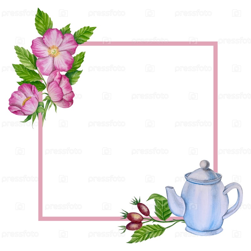 Зеленые свежие чайные листья, чашка чая и чайник для варки, чаепитие с цветками розового бедра и ягодами. Иллюстрация Международного дня чая. Акварель вручную нарисованная изолированными элементами