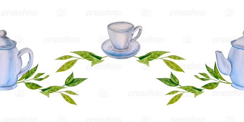 Зеленые свежие чайные листья, чашка чая и чайник для варки, чаепитие с цветками розового бедра и ягодами. Иллюстрация Международного дня чая. Акварель вручную нарисованная изолированными элементами