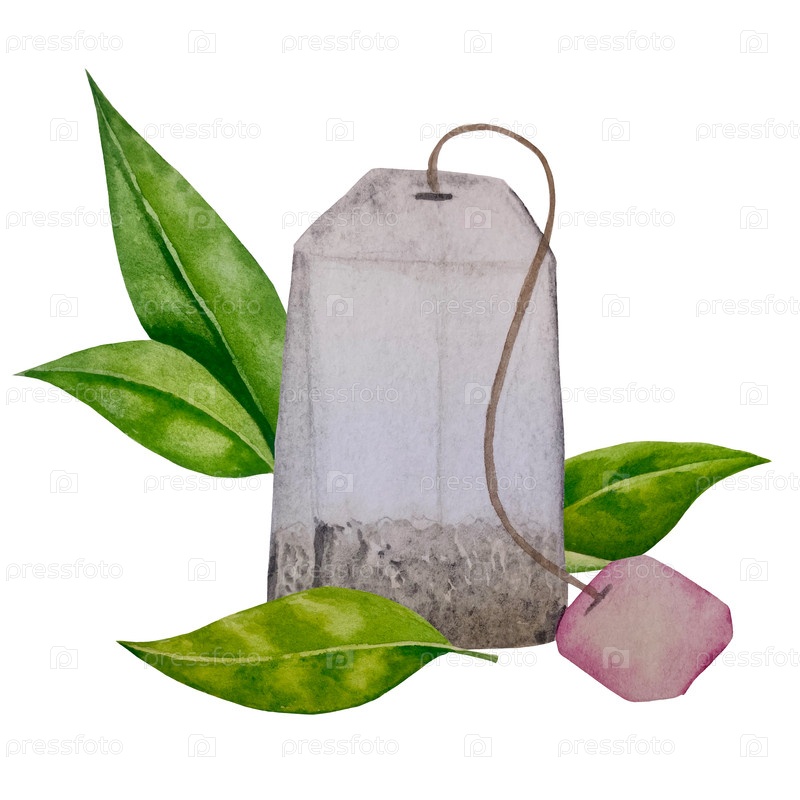 Зеленые свежие чайные листья, чашка чая и чайник для варки, чаепитие с цветками розового бедра и ягодами. Иллюстрация Международного дня чая. Акварель вручную нарисованная изолированными элементами