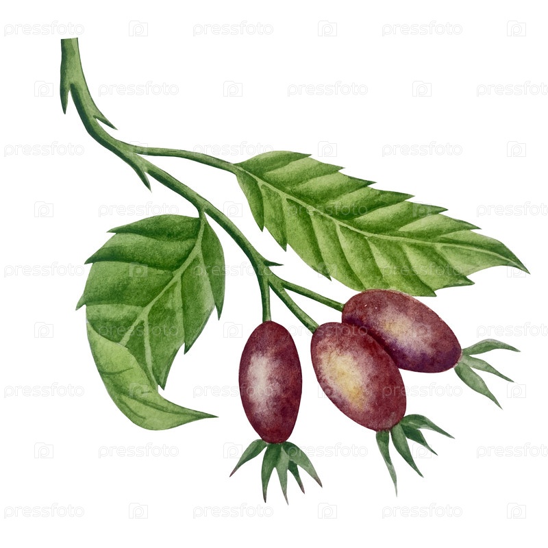 Зеленые свежие чайные листья, чашка чая и чайник для варки, чаепитие с цветками розового бедра и ягодами. Иллюстрация Международного дня чая. Акварель вручную нарисованная изолированными элементами