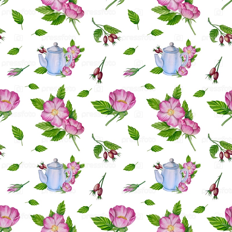 Зеленые свежие чайные листья, чашка чая и чайник для варки, чаепитие с цветками розового бедра и ягодами. Иллюстрация Международного дня чая. Акварель вручную нарисованная изолированными элементами