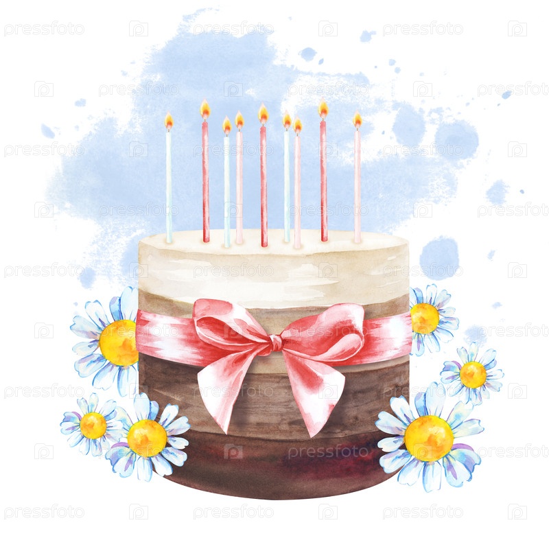Рождественский торт со свечами, розовой лентой и маргаритками на голубом акварельном месте. Илюстрация акварели выделена на белом фоне. Шаблон десерта для открыток, приглашений, поздравлений, свадьб