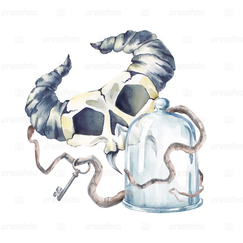 Мистическая иллюстрация акварельной живописи. воображаемый рогатый череп, искривленный корень дерева, обернувшийся вокруг стеклянного купола и ключ, висящий на нем. узоры Хэллоуина. мистика