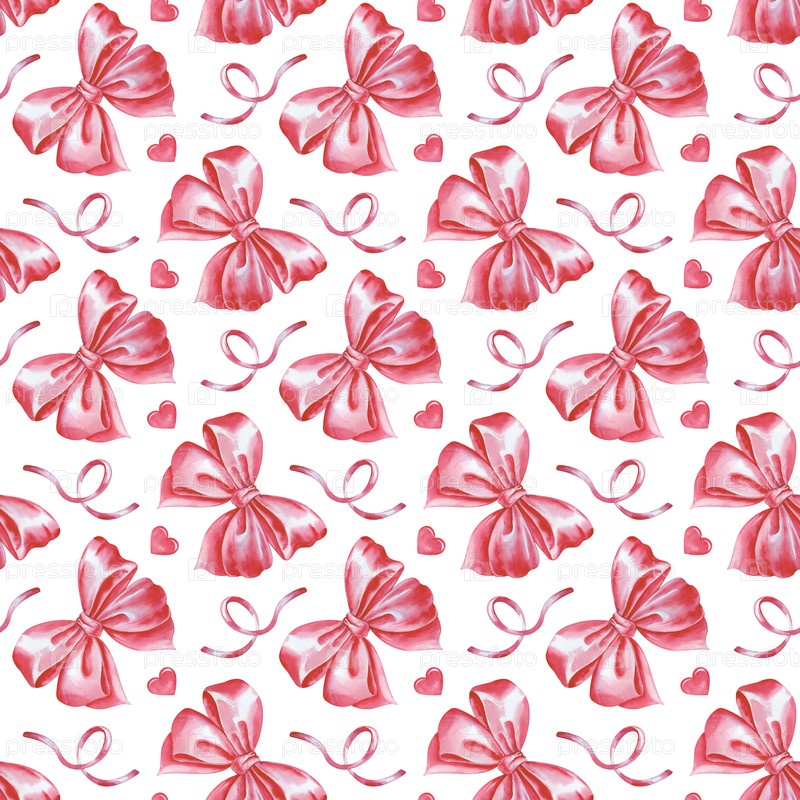 Акварель монохромный гладкий рисунок с розовыми луками, лентами и сердцами на белом фоне. Бесшовный романтический фон. Шаблон для ткани, обоев, упаковки, скапбукинга