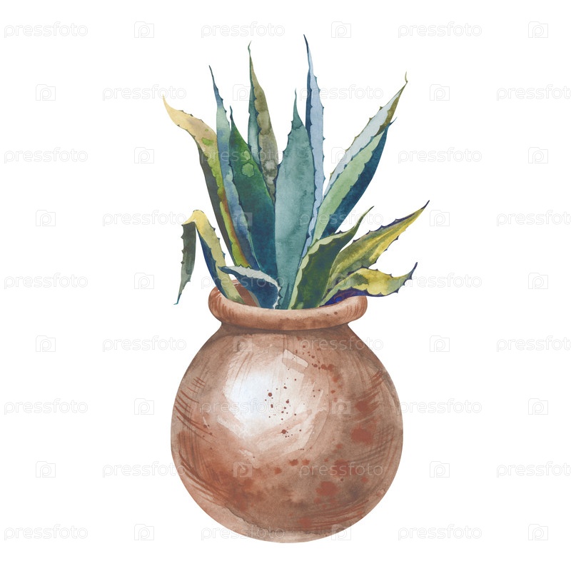 Акварельная иллюстрация алоэ вера, выращенной в круглом глиняном горшке. Ботаническая иллюстрация выделена на белом фоне. Садоводство. Растение для дома. Клипарт