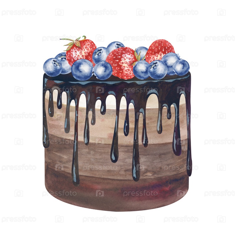 Акварельный шоколадный торт с ягодами, ручной рисунком. Илюстрация акварели выделена на белом фоне. Шаблон для праздничного десерта со клубницей и черники. Для открыток, приглашений, поздравлений