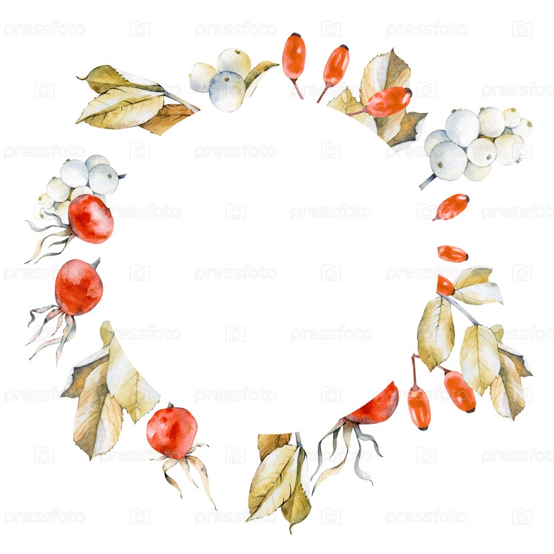 Ботанический круглый каркас с сухими листьями. Розовик и Снежный Человек. Красно-белые сезонные ягоды. Иллюстрация акварели