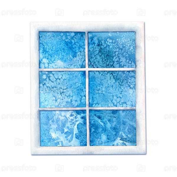 Окно с голубыми узорами мороза на стекле написано вручную на белом фоне. Иллюстрация акварели. Шаблон для праздничных открыток и приглашений. Рождество. Новый год