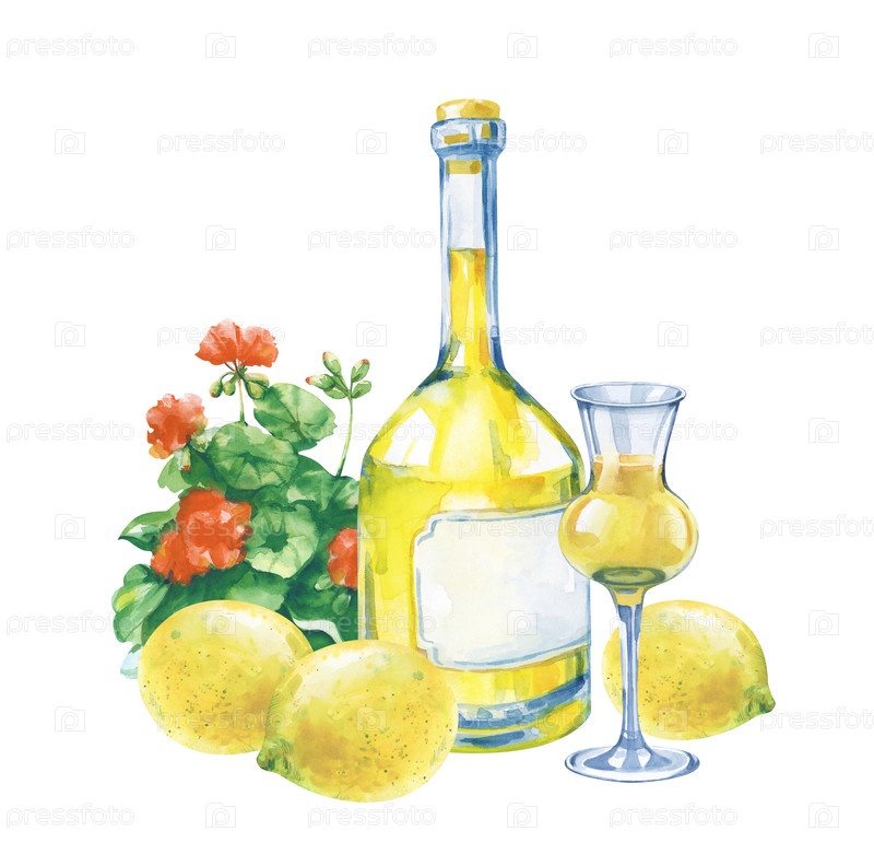 Ручно нарисованная композиция с греческим национальным напитком и красными цветами. Акварельная иллюстрация с фруктовым ликером в бутылке, стеклом, лимонами и геранием. Ботанический шаблон для открыток, брошюр, меню