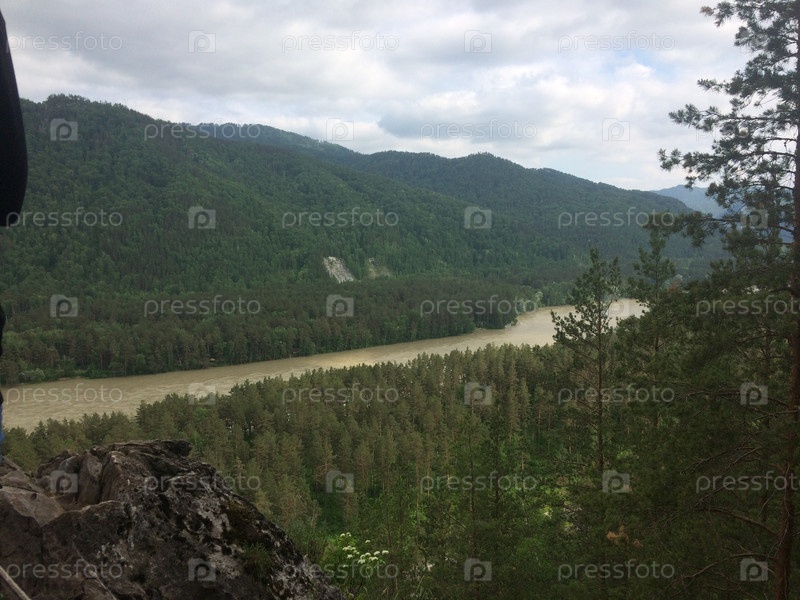 Река течет через пышную зеленую долину с холмами на заднем плане под облачным небом