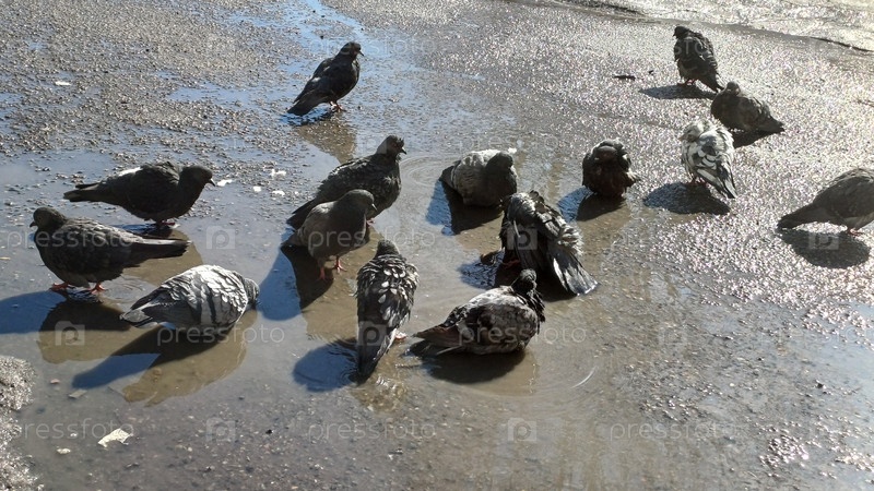Стадо голубей собралось вокруг лужи на городской улице после дождя днем
