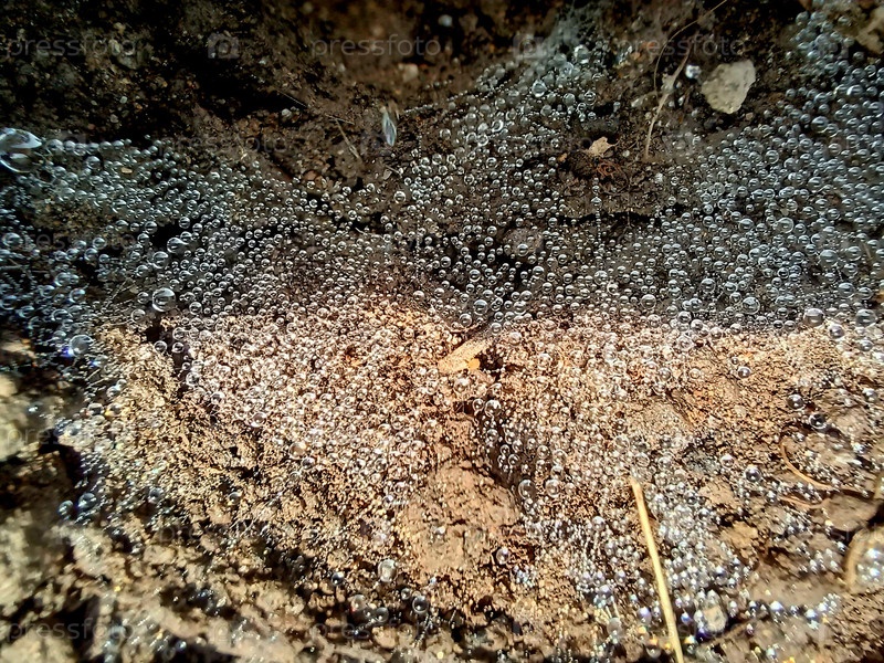 Утренняя роса и паутинный шелк создают красивый рисунок на лесном полу на рассвете в естественной обстановке