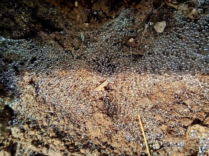 Ранний утренний свет показывает капли росы, цепляющиеся за тонкие шелковые нити паука, сплетенные по лесному полу, подчеркивая мастерство природы в спокойный момент