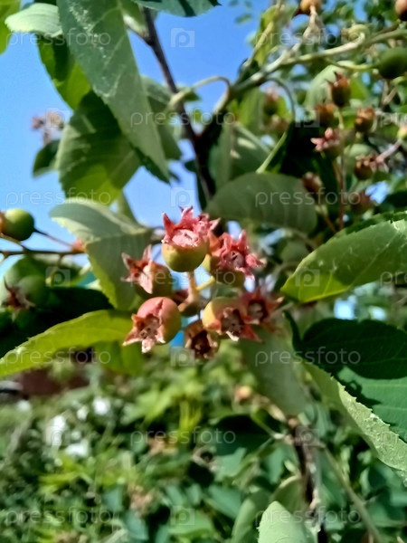 Кластеры незрелой ирга можно увидеть на кустах, окруженных зелеными листьями под ясным голубым небом в саду за двором летом