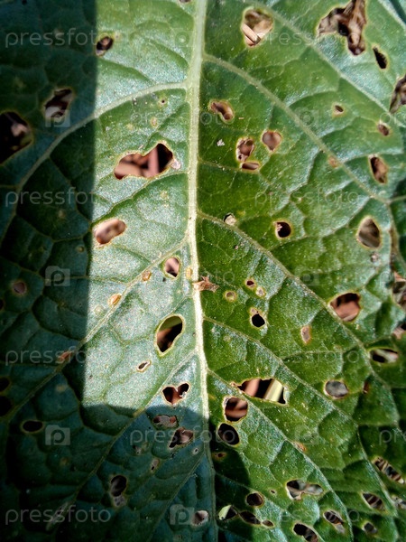 Вид на лист, показывающий повреждения от деятельности насекомых в саду днем