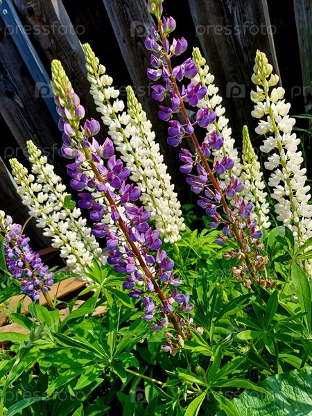 Ярко-фиолетовые и белые люпины цветут в саду под солнечным светом